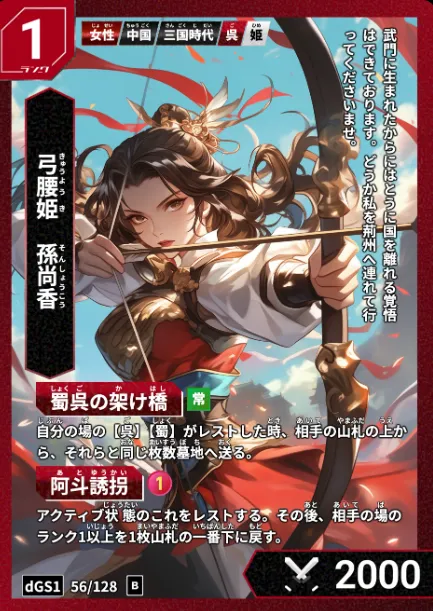 孫権の妹・劉備の妻で、形式上の息子・劉禅を連れて呉に帰ろうとしたことでも知られるのは「孫尚香」です。自分の兵を持ち、しかも勝手に行動するため趙雲が監視役となっていたことでも知られています。