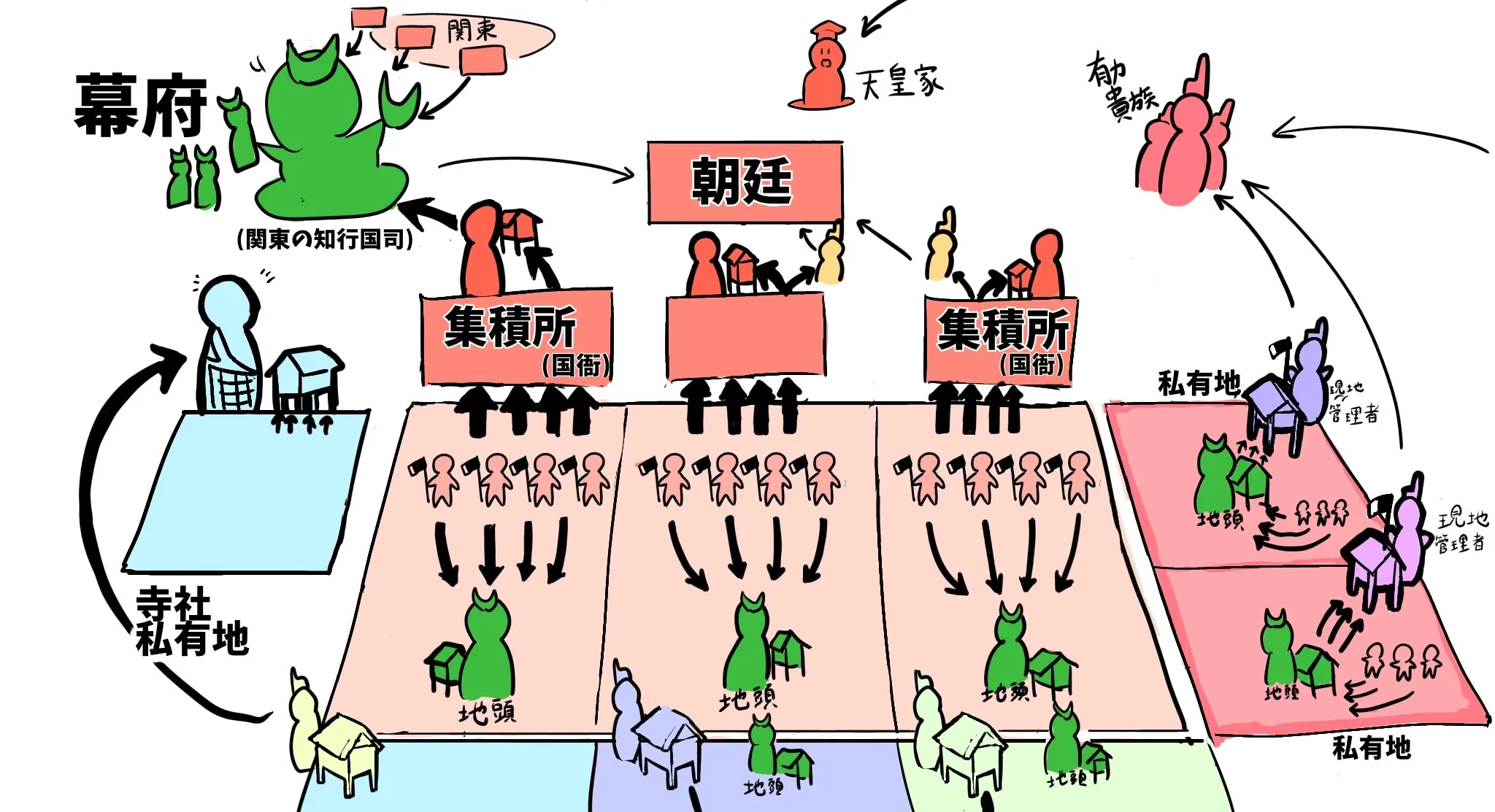 というのも、源頼朝が鎌倉幕府を開くときに、彼は「地頭」と呼ばれる役を全国の朝廷の土地と私有地に認めてこれの立場を幕府が保障して守ることを朝廷に認めさせました。